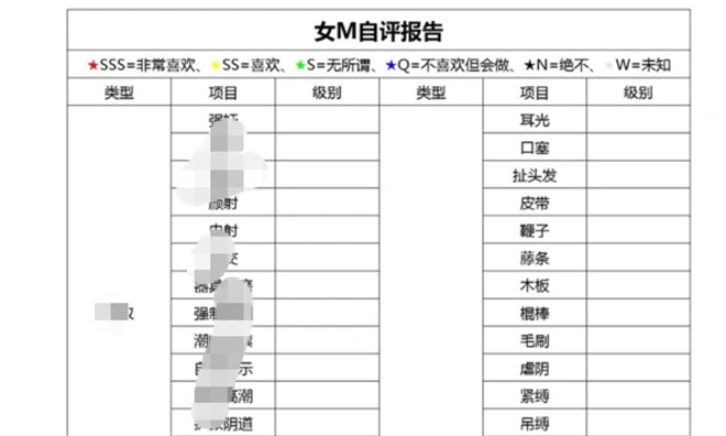 它如同一份“性偏好健康检查报告”,使S/M关系从模糊变得清晰,减少误解。报告多以表格形式呈现,包括身体数据、心理倾向及极限测试等内容。
